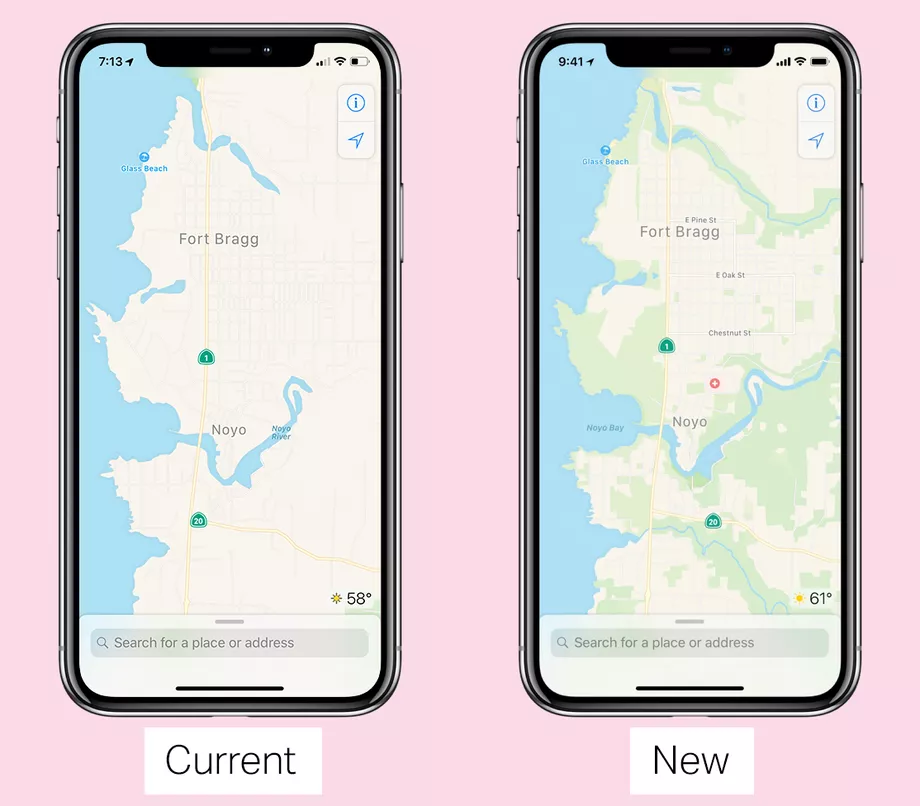 yeni veriler sayesinde haritalarının neye benzediğini yeniden işliyor gibi görünüyor. Artık parkları ve ormanları, daha ayrıntılı su yolları ,ana caddeleri ve farklı sokakları vurgulamak ve haritanın daha kolay okunmasını sağlamak için yeşil renkte göreceksiniz. Apple, TechCrunch‘a göre tam bir yeniden tasarım planlamıyor, ancak Haritalar, daha ayrıntılı verilere sahip olduktan sonra çok farklı görünecek.