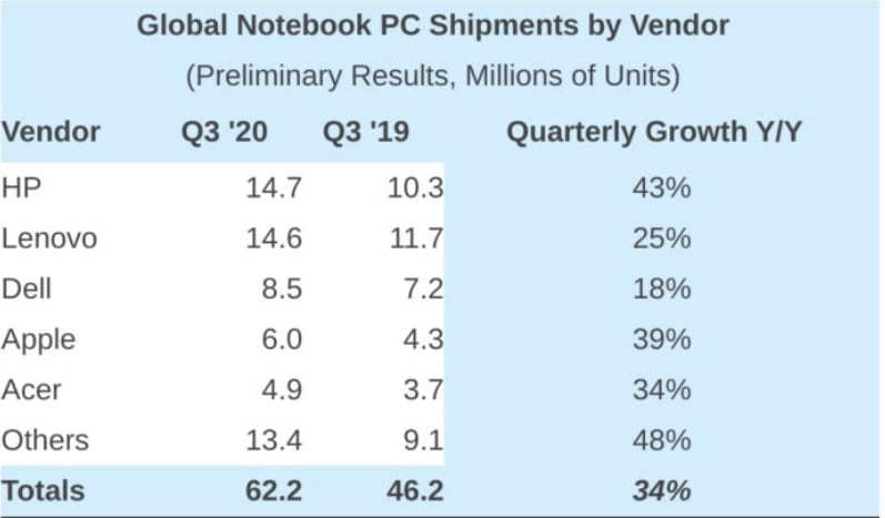 Strategy Analytics, global pazarda 2020‘nin üçüncü çeyreğinde 62.2 milyon adet satışyapıldığını ve pazarın yüzde 34 büyümegösterdiğini açıkladı. Bununla birlikte laptop markalarının pazar payı ve satış rakamları da açıklandı.