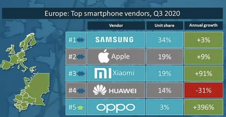 Samsung, %3’lük bir büyüme kaydetmesine rağmen, Avrupa’daki pazar payının %34’ünü elinde bulunduruyor. Buna karşılık ABD teknoloji devi Apple, 2020’nin 3. çeyreğinde tahmini %19 pazar payı ile ikinci sırada yer alıyor. Xiaomi, Apple ile aynı şekilde, pazarın tahmini %19’una sahip olmasıyla 3. sıradaki yerini koruyor. Canalys, Xiaomi’nin pazar payının %91 gibi şaşırtıcı bir yıllık büyümeyi temsil ettiğini bildirdi. Bununla birlikte, raporda yer alan en büyük büyüme, Oppo tarafından oluyor. Oppo %396’lık pazar payıyla Avrupa’nın ilk 5 akıllı telefon satıcısına yükselmesidir.