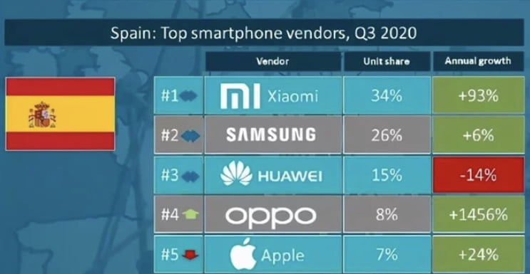 Bununla birlikte Xiaomi, pazardaki %34’lük payıyla İspanya’nın en büyük akıllı telefon satıcısı olarak ortaya çıkıyor. Samsung %26 pazar payı ile ikinci sırada yer alırken, Huawei’nin %15 pazar payı onu üçüncü sıraya yerleştiriyor.