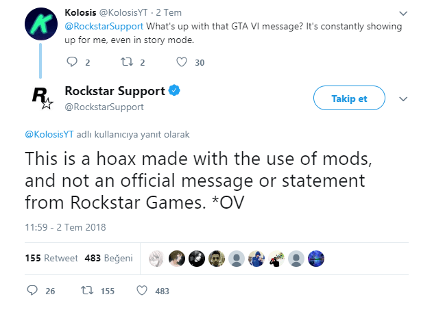 Rockstar Games, GTA 6 çıkış tarihine dair GTA Online‘ın içinden yapılan GTA 6’nın 2019’da çıkacağı bildirimi hakkında Twitter’dan bir açıklama yaptı. Rockstar Games tarafından yapılan açıklamaya göre, oyun içerisinde ortaya çıkan bu bildirim tamamen asılsız. En çok beklenen oyunlardan biri olan GTA 6‘nın 2019 yılı içinde çıkmayacağını söyledi.