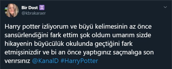 Kanal D, geçtiğimiz günlerde kanalında yayınladığı Harry Potter ve Melez Prens filmindeki “büyü” kelimesini sansürledi. Sosyal Medyada tepkiyle karşılandı.