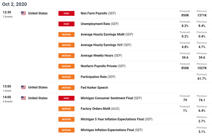 NFP verilerinin, geçen ay ekleneceği tahmin edilen 875 bin yeni işle bugün daha sonra (12:30 GMT) yayınlanması planlanıyor. ABD seçimleri, Trump’ın COVID açıklaması ve Fed’in Ortalama Enflasyon Hedeflemesi (AIT) politikası bu durumu olumsuz etkileyebilir. Bununla birlikte, Bloomberg’in fısıltı işlevine göre, piyasa katılımcıları, eklenecek önemli ölçüde daha büyük 1000 bin yeni işe bakıyor olabilir. Potansiyel olarak daha yüksek olan bu maaş bordrosu rakamı ABD Dolarını destekleyebilir .