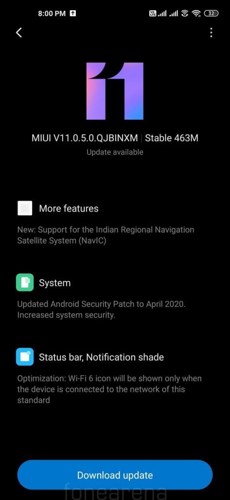 Xiaomi, MIUI 11.0.5.0.QJBINXM’i Android güvenlik yaması ile kullanıma sunmaya başladı. Güncelleme yaklaşık 463 MB boyutunda ve NavIC (Hint Bölgesel Uydu Konumlandırma Sistemi) desteği ve Wi-Fi 6 simgesi getiriyor. Bilindiği üzere Mart Ayı Android Güvenlik Yaması ile MIUI 11.0.4.0.QJBINXM kullanıma sunulmuş ve yaklaşık 447 MB boyutunda olan güncellemeyle kullanıcıların şikayetçi olduğu aşırı ısınmaya neden olan sorun düzeltilmişti.